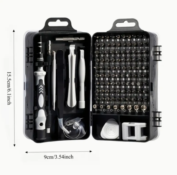 Kattava valikoima tarkkuusruuvimeisselin kärkiä ja muita tarvikkeita.