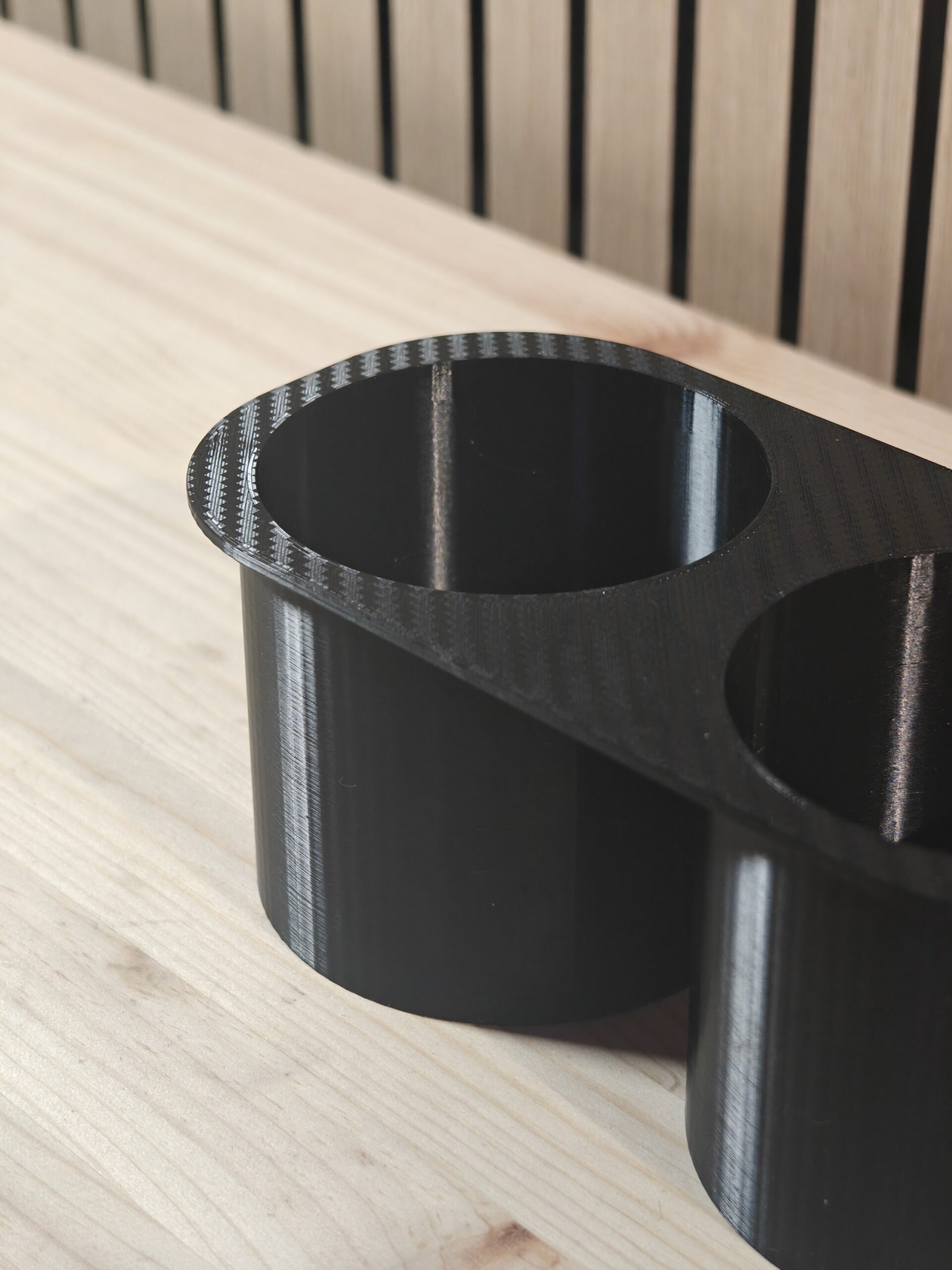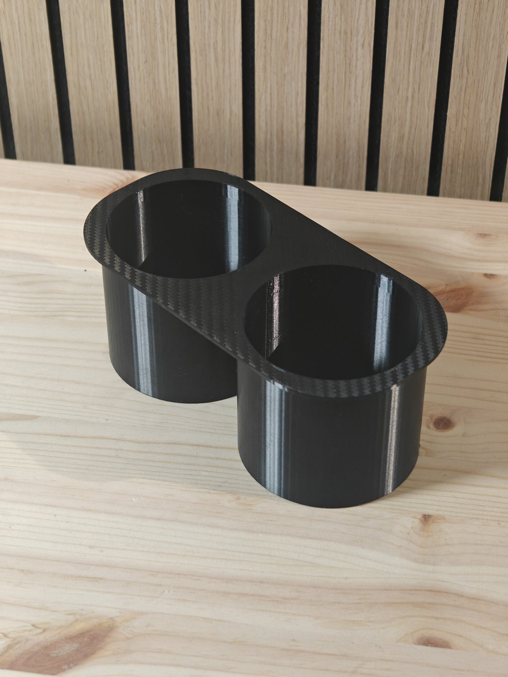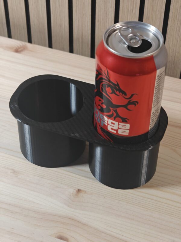 Eikö isot tölkit pysy juuri avattuna pystyssä? Tässä ratkaisu! Siisti 3D tulostettu mukitelineen parannuspala jolla estät tölkkien kaatumisen ajon aikana. Hiilikuitu kuviolla. Myös normaali versio saatavilla nettisivuiltamme.